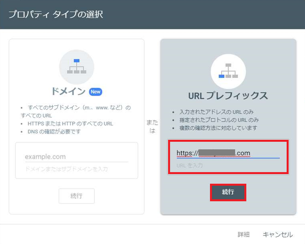 ②URLプレフィックスに「https://XXXXXXXX.com」というように自分の取得したドメイン名を入力し「続行」ボタンをクリックします。
