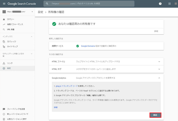 ④「設定」→「所有権の確認」→「Google Analytics」を開き「確認」ボタンをクリックします。