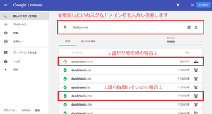 Google Domainsにて空いているカスタムドメインを検索します。既に誰かが取得している場合は「使用不可」と表示されます。「緑チェックマーク」が付いているものから選びましょう。この時点ではカスタムドメイン名を決めるだけで「カスタムドメイン取得」は行いません。後述の手順にて「カスタムドメイン取得」を行います。![]()