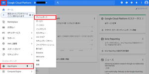 ①画面左上部の「3本横線」をクリックし「App Engine」→「ダッシュボード」を順にクリックします。![]()