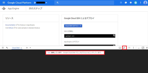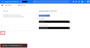 ⑤数分後、画面左下に「App Engine アプリが正常に作成されました」と表示されるので、「後で」をクリックします。![]()